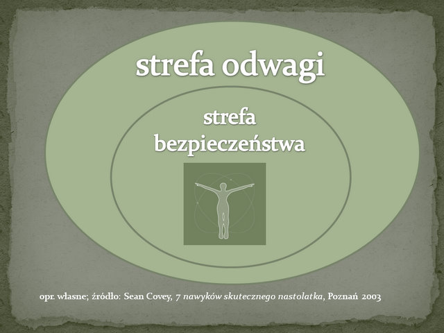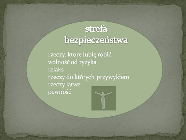 Posłużę się pewnym schematem. Każdy z nas funkcjonując w szkole, pracy, domu ma wokół siebie pewną, umownie rzecz ujmując, strefę bezpieczeństwa: znajome miejsca, rzeczy, które lubi robić, rzeczy do których przywykł, rzeczy łatwe. Strefa ta wolna jest od ryzyka, nie wymaga przełamywania wewnętrznych oporów. W niej czujemy się spokojni, bezpieczni i zrelaksowani. Jest to dobre miejsce, właśnie dlatego, że daje nam poczucie bezpieczeństwa i w tej sferze zwykle spędzamy większą cześć naszej aktywności.