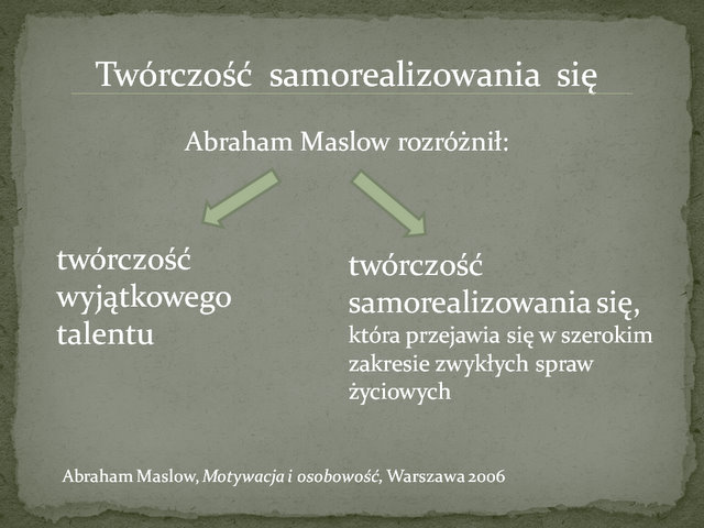 Abraham Maslow zastanawiając się nad pełnią rozwoju jednostki używał słowa twórczość. Wprowadził bardzo ciekaw rozróżnienie: twórczość wyjątkowego talentu oraz twórczość samorealizowania się. Zastanawiając się nad tym czym jest twórcze życie, twórcza postawa i w końcu twórcza osoba, doszedł do wniosków, że oprócz potocznie rozumianego twórczego działania, czyli namalowania obrazu, skomponowania utworu czy napisania poematu, istnieje też coś takiego jak twórczość samorealizowania się, która przejawia się w szerokim zakresie zwykłych życiowych spraw.
