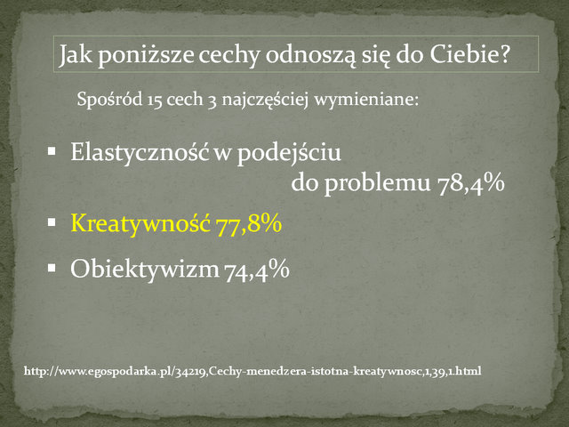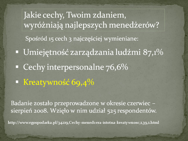 Swoją drogą ciekawa byłaby analiza w jaki sposób system edukacji przygotowuje dzisiejszego ucznia do w/w wymagań… ale wróćmy do kreatywności. Bardzo ciekawe badanie zostało przeprowadzone wśród kadry zarządzającej w sierpniu 2008. Wzięło w nim udział 525 respondentów. Przytoczę tylko dwa pytania.