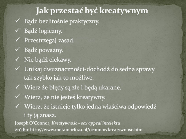 Rozważania na to pytanie zacznę trochę przewrotnie od przepisu na „zabicie” kreatywności: