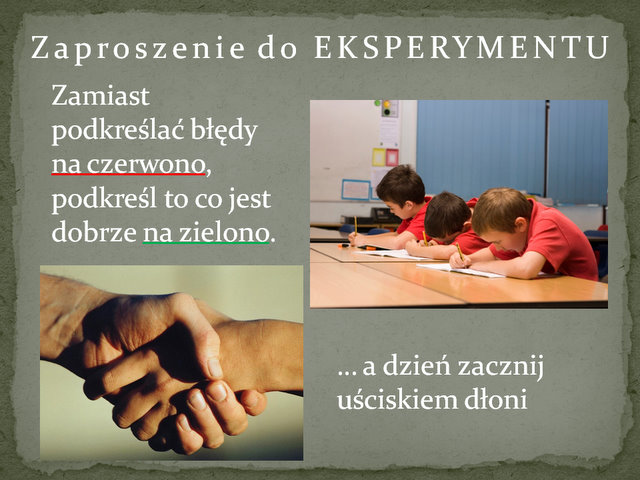 Polska szkoła wyspecjalizowała się w tropieniu wszelkich uchybień i na czerwono podkreślaniu, by uczeń na pewno nie zapomniał, co dziś mu poszło nie tak jak powinno. A może wystarczy tylko zakręcić to „koło fortuny ocen” i wyrzucić czerwone długopisy… i na zielono podkreślać, czego właśnie dziś nauczył się Jaś, czy Asia. I docenić, że wyraz „róża” ma właściwe „ó” i „ż” odpowiednie. A błędy, cóż – zamazać korektorem, by uczeń miał szansę odszukać właściwe rozwiązanie, i by błąd nie „wdrukowywał” mu się w pamięć.