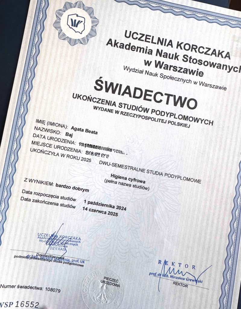 Chęć pogłębienia tematu oraz aktualne społeczne wyzwania: życie w cyfrowym świecie, zaowocowały ukończeniem studiów: higiena cyfrowa.