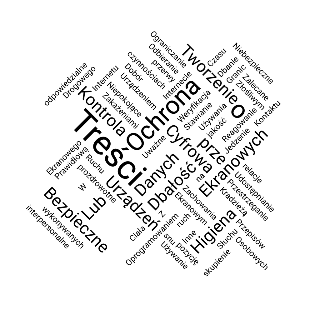 Chmurę słów stworzyłam na podstawie czterech obszarów higieny cyfrowej stworzonych przez Instytut Cyfrowego Obywatelstwa. Koniecznie zobacz bogate zasoby Fundacji Instytut Cyfrowego Obywatelstwa.